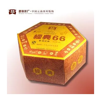 本產品是?海茶廠為了紀念建廠66週年而製的特製品。本品沱形優美、條索勻稱,呈透亮的琥珀色,香氣純正濃郁,滋味醇濃回甘,為地道的「?海味"產品極其有限。採用發酵適度的細嫩芽茶撒面、蓋底,中壯茶葉為?堙A湯色紅濃,陳香純正,滋味醇濃,回甘生津,餘味持久,葉底褐紅泛青柔軟而有彈性乃貯藏醇化之佳品。